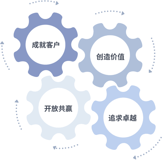 成就客户是一切决策的出发点,,,,创造价值是衡量所有工作的标准,,,,追求卓越是我们做事做人的态度,,,,开放共赢是我们的格局也是最终的结果。。。价值观的齿轮环环相扣,,,推动着组织里的每个人不断向前。。