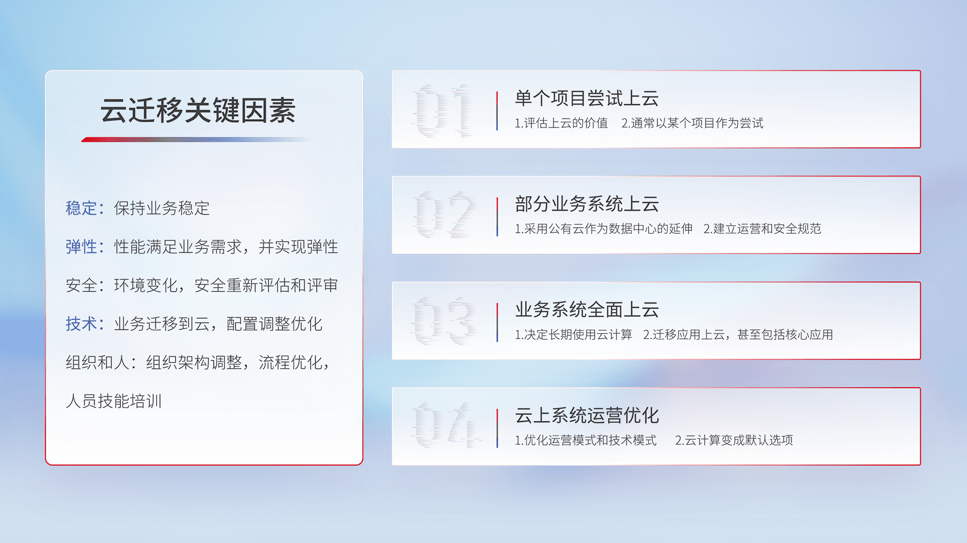 结合实际业务,,,从规划设计、、、、云平台选型、、、、云原生改造、、数据迁移、、、、集成交付,,,迁移全过程为客户识别最佳上云路径,,,做好风险识别管理,,,设计网络架构、、、、身份权限、、、安全审计合规、、操作审计、、、日志审计、、、监控告警策略、、、多站点容灾设计等,,对云上基础设施进行整体规划,,,提升IT治理水平,,,以满足弹性、、、、高可用、、、、高性能的需求。。