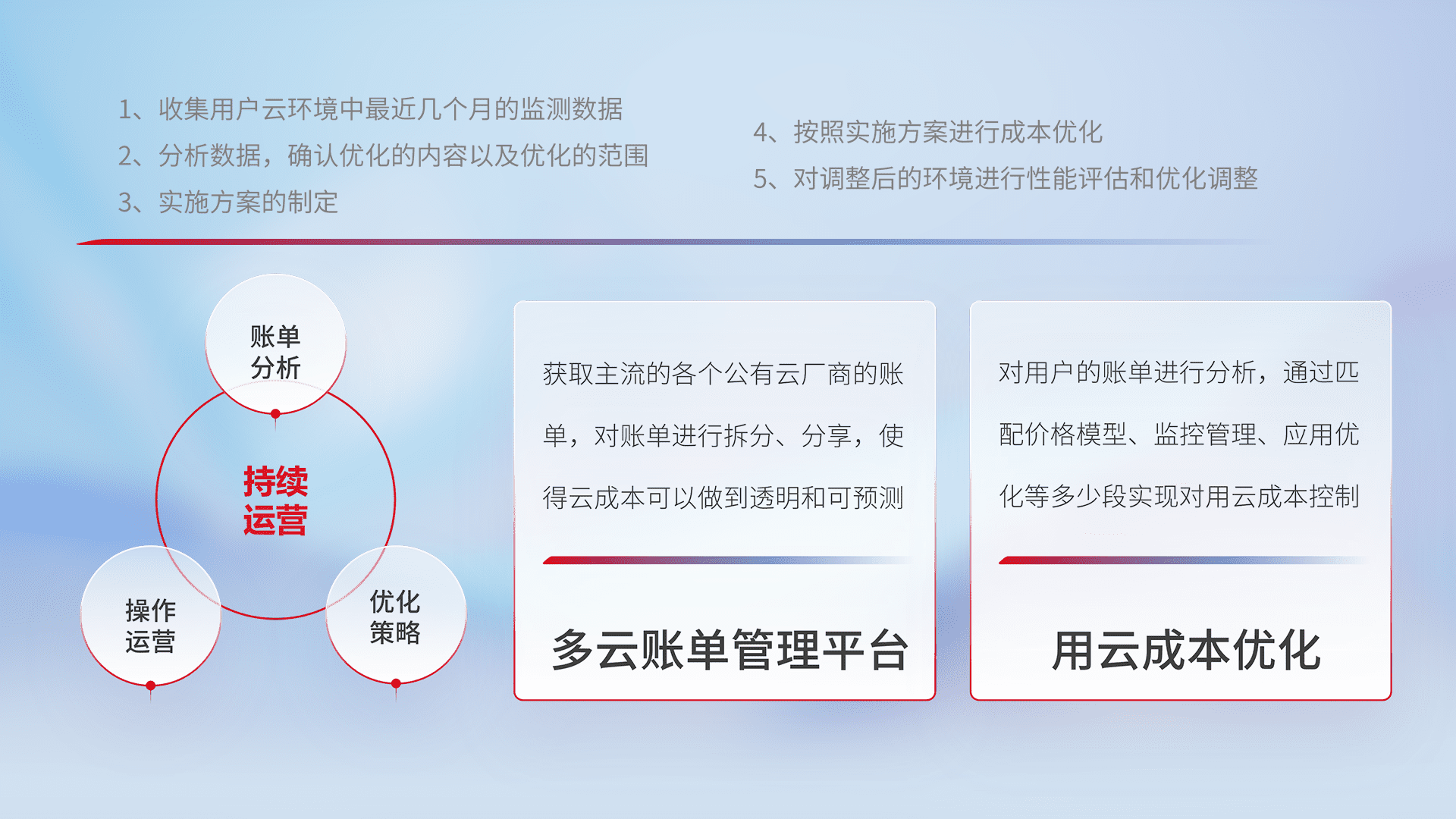 通过灵活运用多种自动化迁移工具,,,,帮助企业用户实现业务和数据高效 、、稳定的上云迁移和云上迁移,,,,采用自研多云纳管平台,,,,以中立管理模式,,解决多组织、、多云、、、、多运维厂商的复杂关系的管理,,保证多云平台资源配置的一致性,,,实时掌控云资源运行数据,,,,运用智能化工具分析云资源多云平台的管理服务,,,透明化管理成本支出,,,,用云成本可预测、、、用云费用可优化、、、、云资源配额有据可依。。