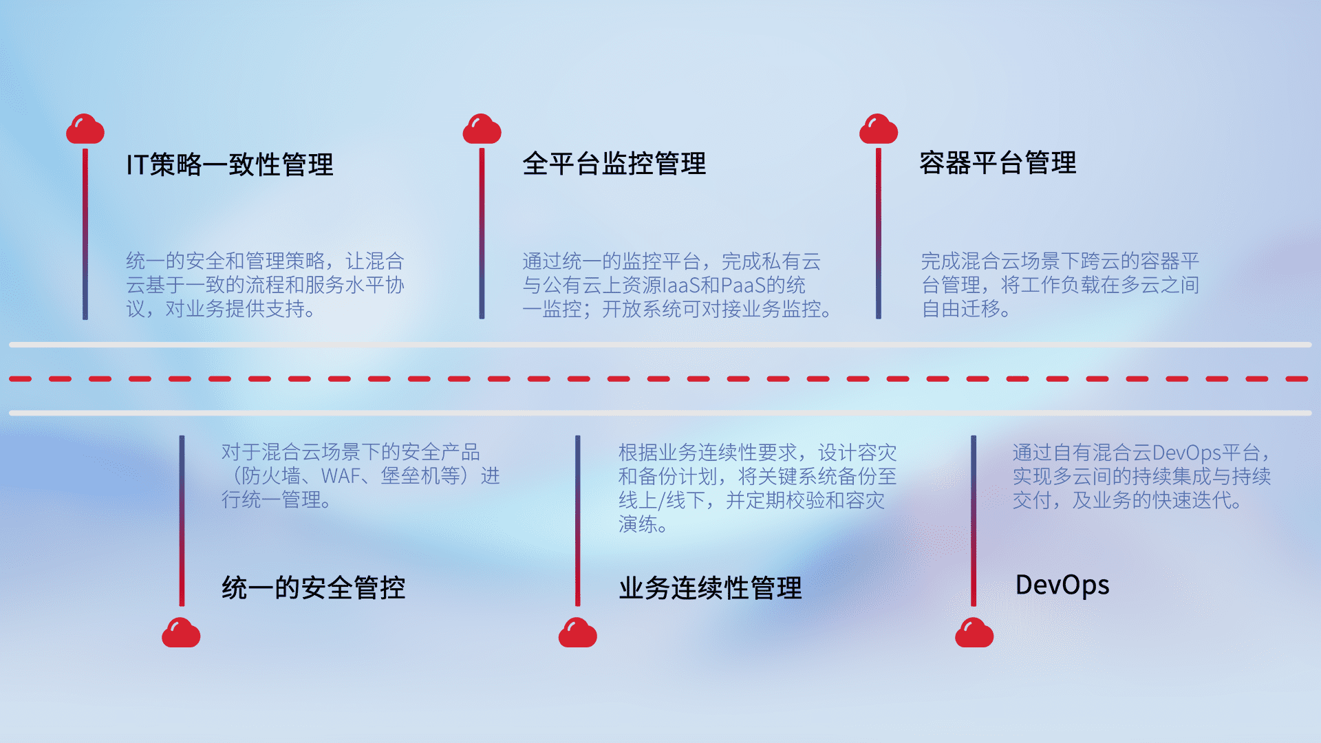 通过多云纳管,,,,以统一的资源数据模型把客户的云资源进行抽象和封装,,进而实现对多云资源的统一操作,,,保障云资源管理的可靠性、、、、稳定性与可用性。。。。量身定制化运维内容,,配置、、开发运维、、、补丁管理、、、备份、、、、监控、、、、认证和访问管理、、、审计和日常巡检等,,,保障在用云过程中的可靠度,,,稳定度以及高可用率。。。