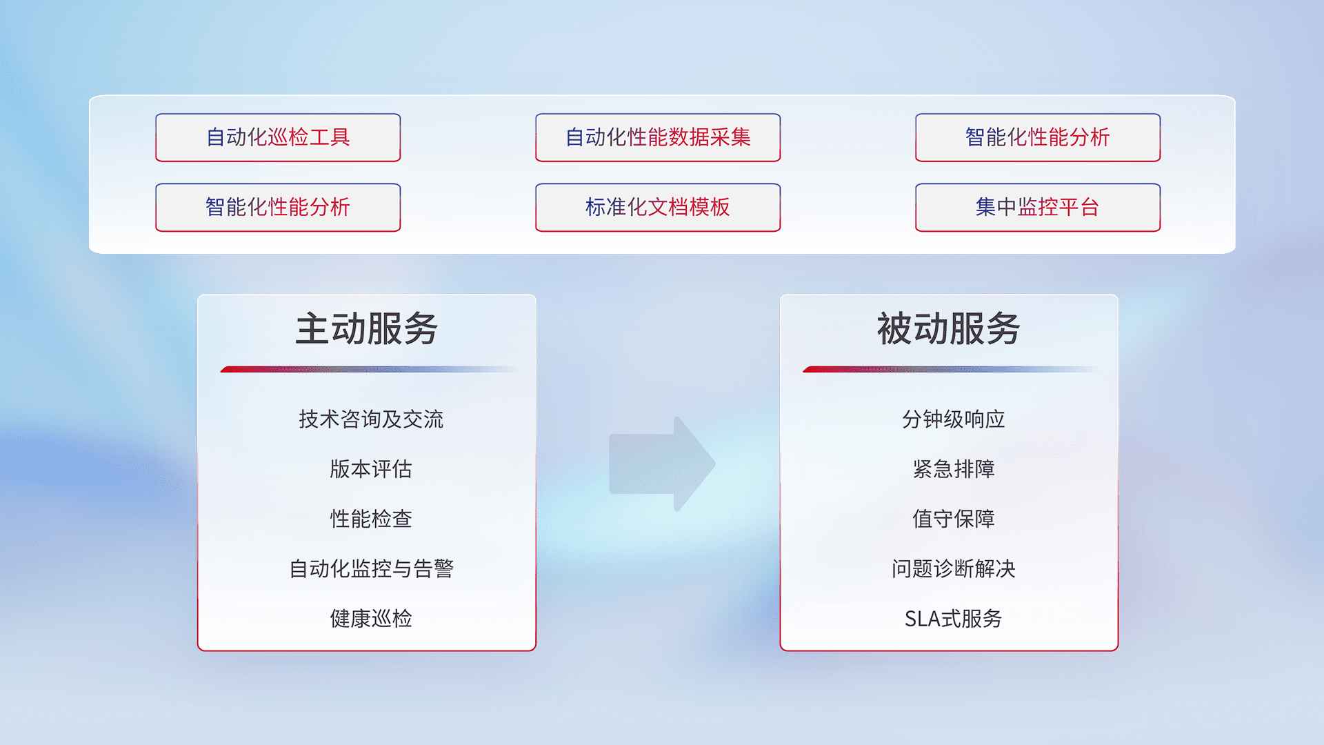 智能化工具和标准化文档,,,保障服务质量,,,提供主动服务(包含技术咨询、、、版本评估、、性能检查、、自动化监控与告警、、健康巡检)和被动服务包含(分钟级响应、、、紧急排障、、、、值守保障、、、、问题诊断解决、、、、SLA服务)。。。